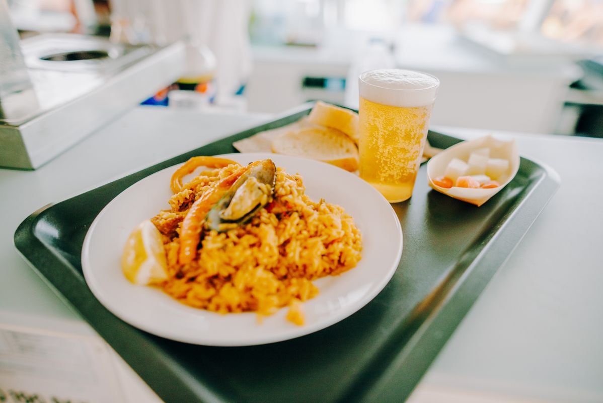 Food on board: delicious paella and fresh fruit