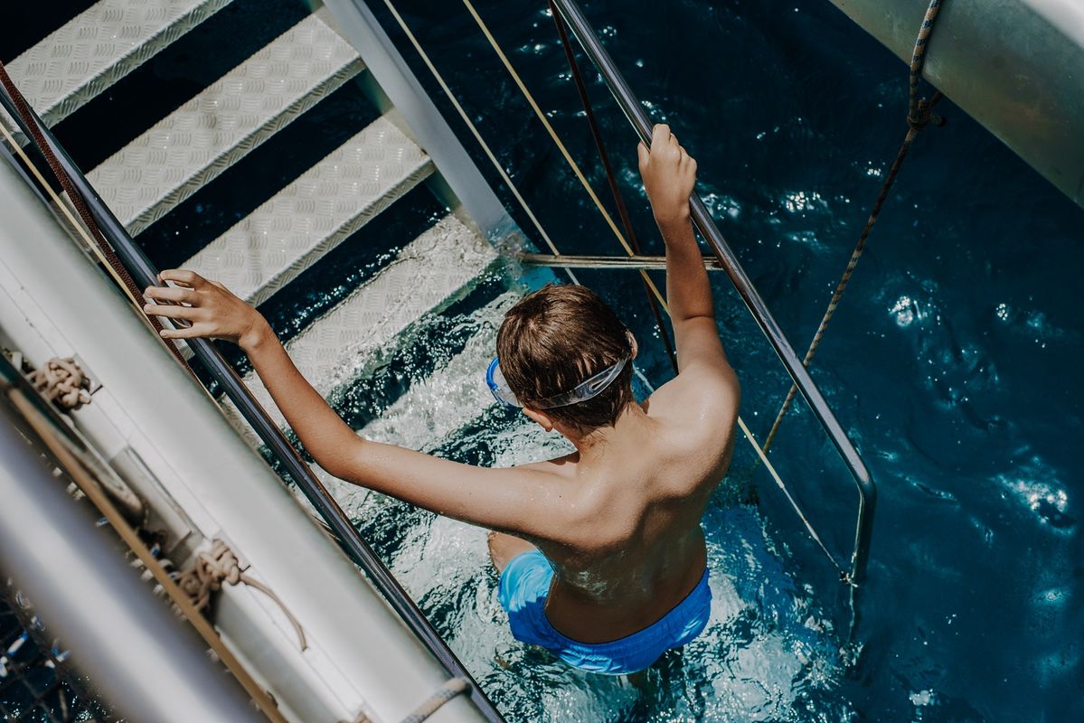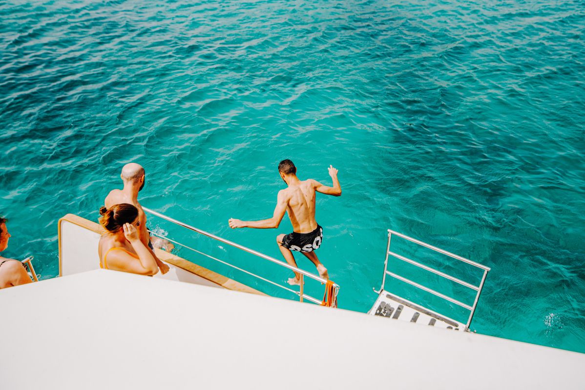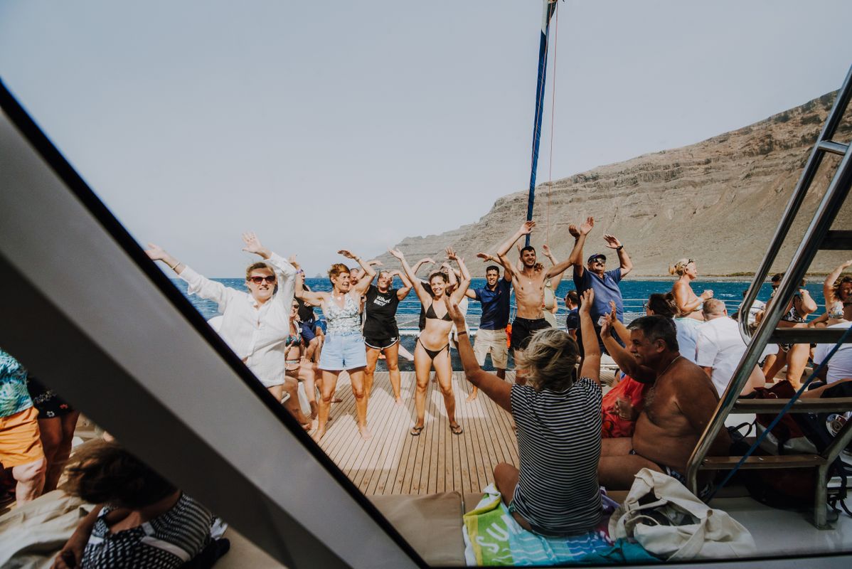 Later, at the pier, we will embark on our luxurious catamaran. A mojito and a tortilla skewer will be waiting to welcome you. We will sail along the south coast of La Graciosa without losing sight of the skyline of Lanzarote and we will anchor in a small hidden paradise