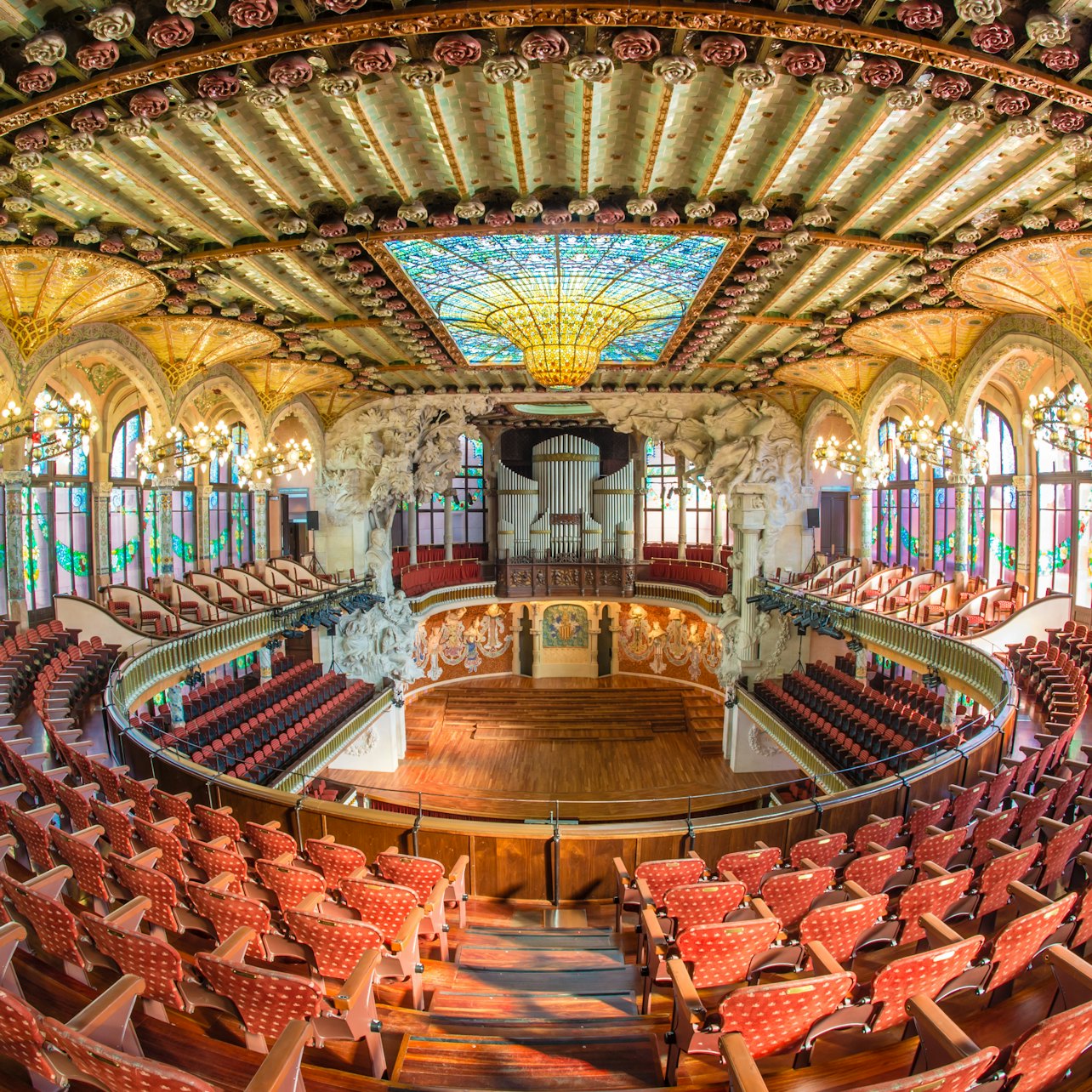 Grab Palau de la Música Catalana tickets and explore a luxurious *Catalan Art Nouveau* masterpiece. This magnificent Barcelona concert hall unites the decorative arts of sculpture, mosaic, stained glass and ironwork to provide an uplifting setting for the concerts that are regularly held there. This guided tour takes you deep into this jewel of *Barcelonan Modernism*.